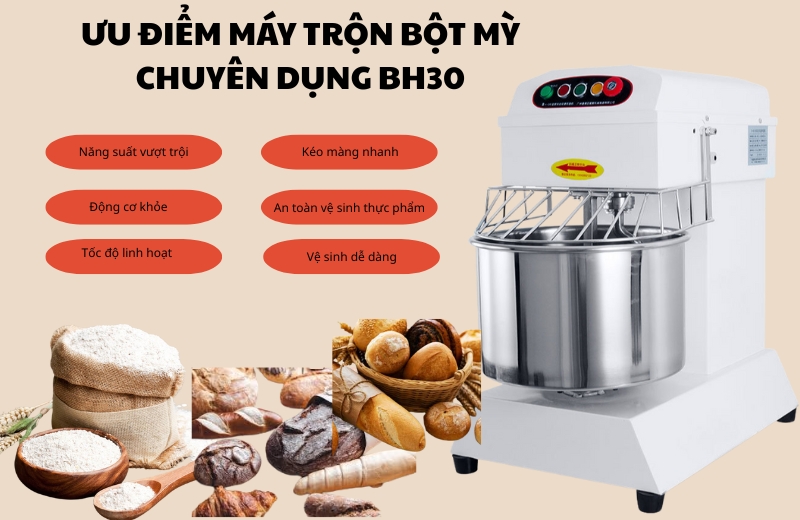 Máy trộn bột chuyên dụng BH30 là giải pháp hoàn hảo cho các tiệm bánh và cơ sở sản xuất muốn nâng cao năng suất và chất lượng sản phẩm. Công suất lớn – vận hành ổn định – đa năng – bền bỉ giúp bạn tối ưu chi phí nhân công và tăng lợi nhuận dài hạn.