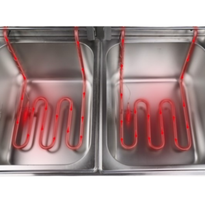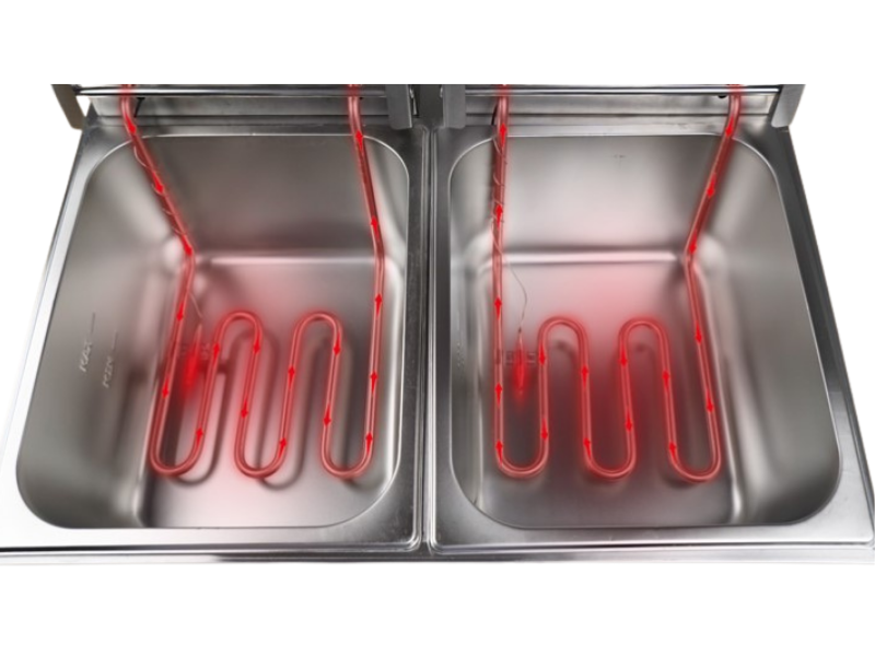 - Thanh nhiệt uốn vòng trải đều ở đáy khoang chiên giúp nhiệt tản đều khắp đáy. Bên cạnh đó, diện tích thanh nhiệt tiếp xúc với dầu lớn nên sẽ đun sôi dầu ăn nhanh hơn.