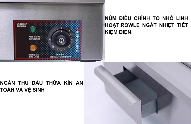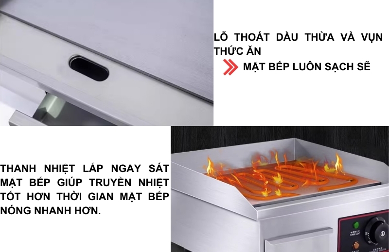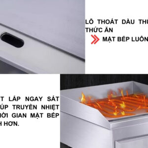 Bề mặt bếp phẳng, dày, được gia công kỹ lưỡng giúp phân bổ nhiệt đều và hạn chế cong vênh khi sử dụng lâu dài. Ngoài ra, bếp còn được trang bị khay hứng dầu mỡ, giúp giữ vệ sinh khu vực nấu nướng và tiết kiệm thời gian dọn dẹp.