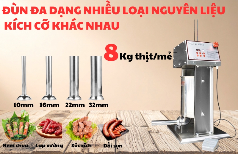 Bộ đầu đùn đi kèm nhiều kích thước khác nhau giúp bạn dễ dàng tạo ra nhiều loại xúc xích với kích cỡ theo nhu cầu.