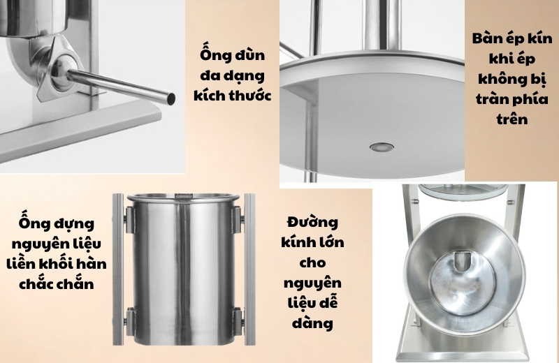 Máy được thiết kế với cấu tạo đơn giản nhưng rất chắc chắn và tối ưu cho quá trình nhồi xúc xích.
