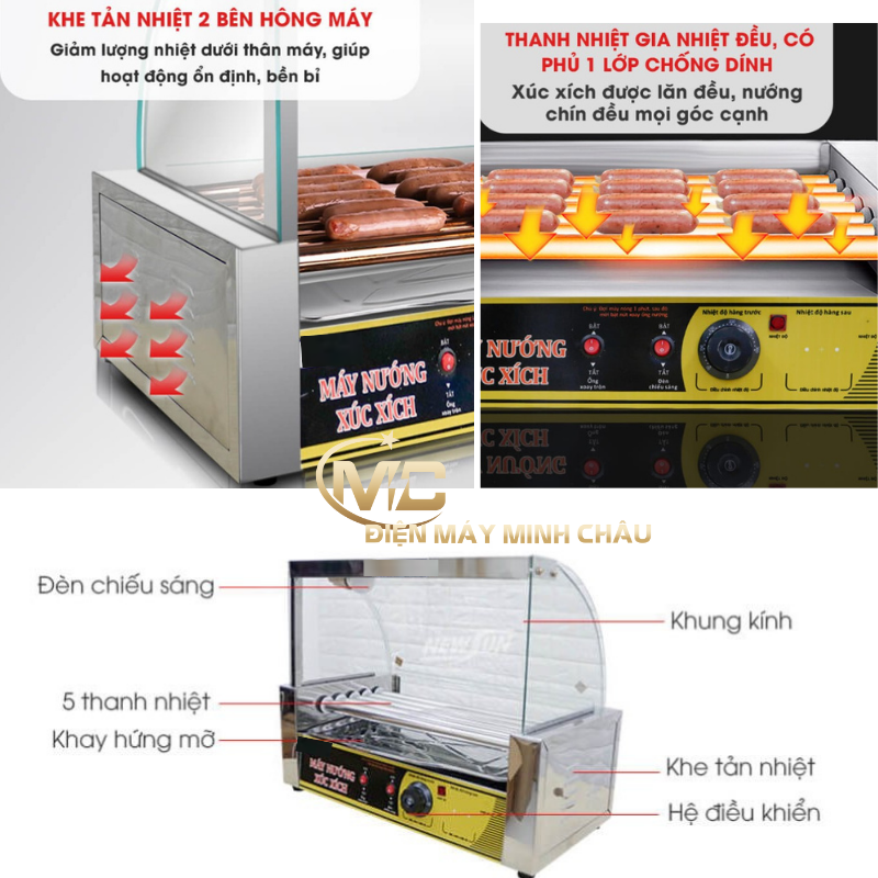 - Nhìn chung, máy nướng xúc xích 5 thanh Dienmayminhchau được thiết kế khá chắc chắn, hình thức đẹp mà tính năng sử dụng rất hiện đại. Sản phẩm giúp các cửa hàng đồ ăn nhanh, quán đồ ăn vặt xung quanh các công viên, trường học, hội chợ,…nướng xúc xích, lạp xưởng, thịt viên tiện lợi, có thể di chuyển dễ dàng và tiết kiệm được thời gian, công sức.