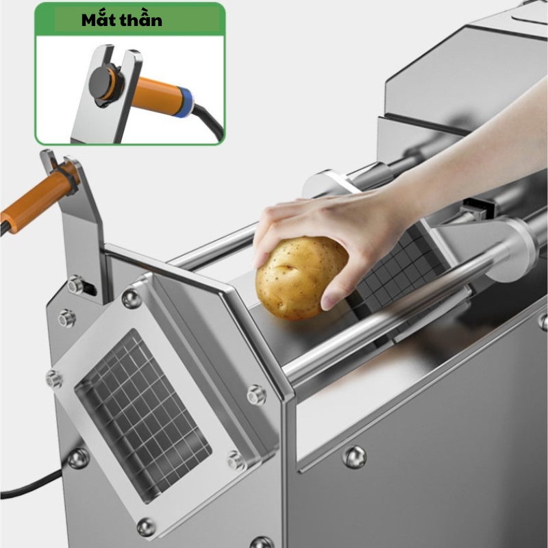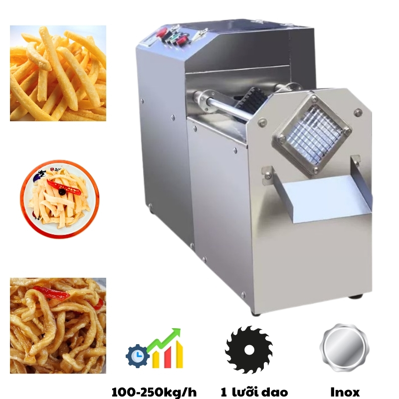 Máy sử dụng motor điện để đẩy nguyên liệu qua khuôn cắt. Đây là lựa chọn hàng đầu cho các quán khoai tây chiên, cửa hàng đồ ăn nhanh có lượng khách ổn định mỗi ngày.