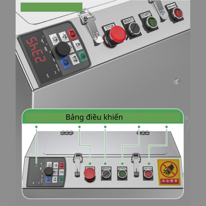Vận hành: Đặt củ quả vào khay theo chiều dọc, nhấn cần gạt hoặc bấm nút điện. Lưu ý không dùng tay đẩy trực tiếp vào sát mặt dao.