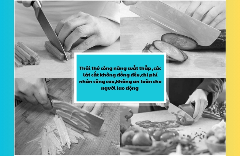 → Có. Có thể thay bộ dao theo nhu cầu thái lát, sợi hoặc cắt khúc.