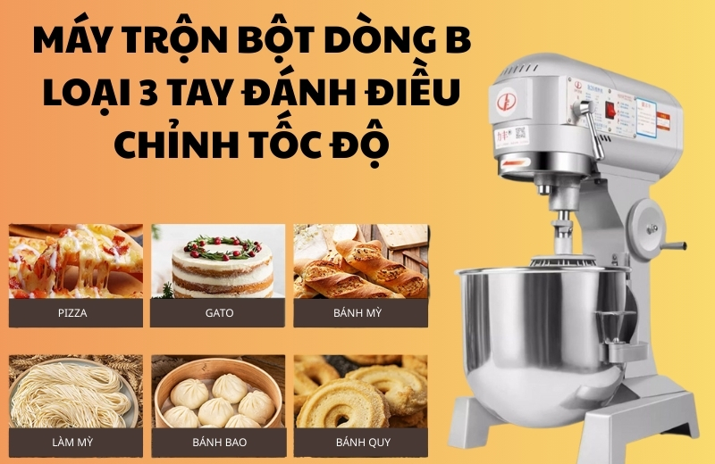 Máy trộn bột B10 là dòng máy trộn bột hành tinh 10 lít được ưa chuộng nhất hiện nay trong các tiệm bánh nhỏ, quán cà phê, tiệm trà sữa và bếp gia đình kinh doanh online. Thiết kế gọn gàng, motor khỏe, vận hành ổn định giúp trộn bột, đánh kem, trộn nhân nhanh chóng và đồng đều.