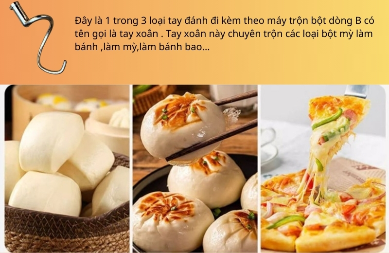 Càng móc câu hay càng tay xoắn (trộn bột).là một trong ba loại tay đánh đi kèm theo máy trộn bột dòng B.Càng móc câu này chuyên dụng trộn các loại bột mỳ làm bánh mỳ ,bánh bao,bánh pizza hay các loại mỳ tươi….