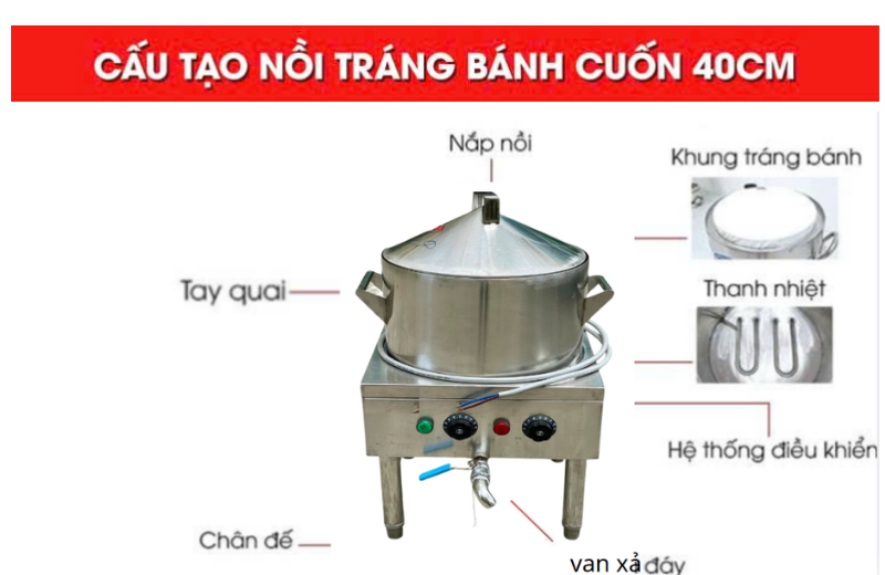 Nồi tráng bánh cuốn 40cm có cấu tạo khá đơn giản nhưng từng bộ phận, chi tiết được gia công tỉ mỉ, mang đến một thiết bị tráng bánh cuốn hiện đại, vận hành an toàn và sạch sẽ.