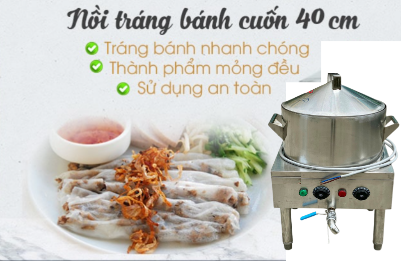Nồi tráng bánh cuốn 40cm dùng điện là thiết bị chuyên dùng cho việc tráng bánh cuốn, bánh ướt, bánh mướt. Nồi vận hành hoàn toàn bằng nhiên liệu điện, cài đặt và kiểm soát nhiệt độ tự động giúp cho quá trình tráng bánh diễn ra nhanh, an toàn và sạch sẽ. Thành phẩm bánh cuốn mỏng dai, mướt mịn, dễ lấy.