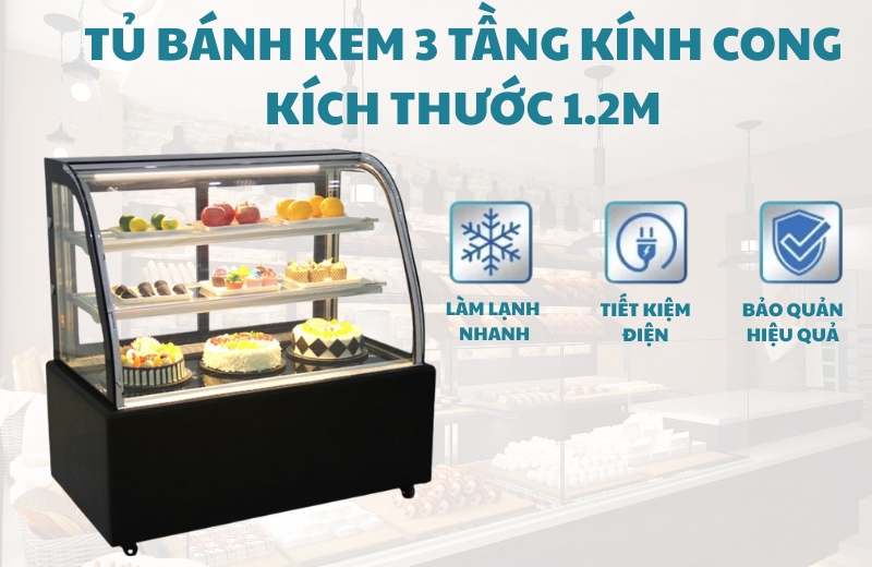 Tủ bánh kem 3 tầng 1m2 kính cong – Đẹp từ ánh nhìn đầu tiên, bền bỉ theo năm tháng