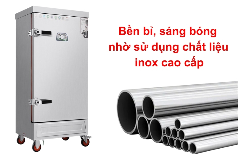 Khác với nhiều dòng tủ hấp cơm công nghiệp Trung Quốc sử dụng inox mỏng, tủ hấp 6 khay điện Việt Nam được sản xuất từ inox cao cấp, cho phép khách hàng lựa chọn: