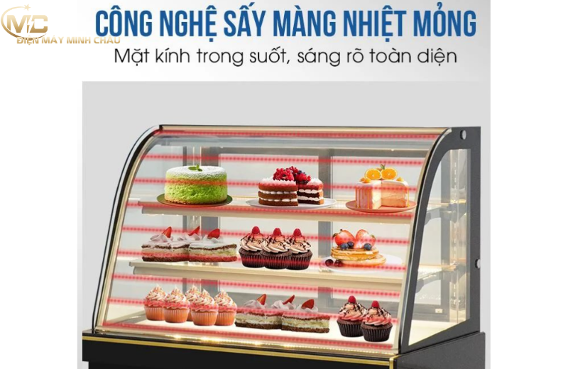 Tủ bánh kem 3 tầng 1m2 kính cong được trang bị hệ thống sấy kính tiên tiến, đảm bảo tất cả các mặt kính luôn trong suốt và không bị mờ sương, ngay cả trong điều kiện thời tiết ẩm ướt.