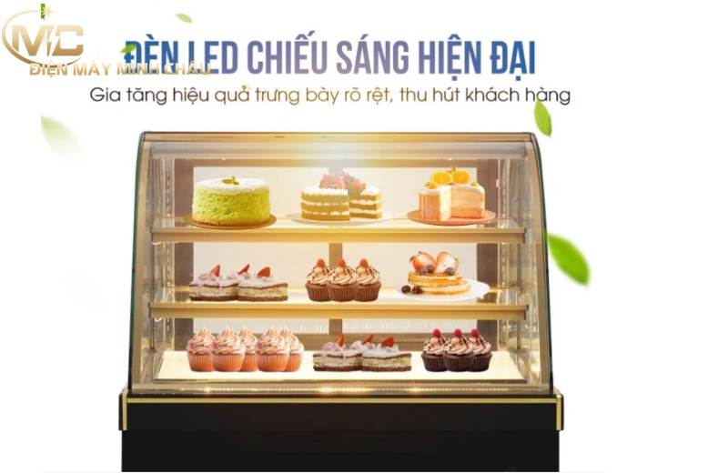 Tủ bánh kem 3 tầng 90cm được trang bị hệ thống đèn LED riêng cho từng tầng, trải dài theo chiều ngang tủ, đảm bảo chiếu sáng đồng đều mọi ngóc ngách bên trong.