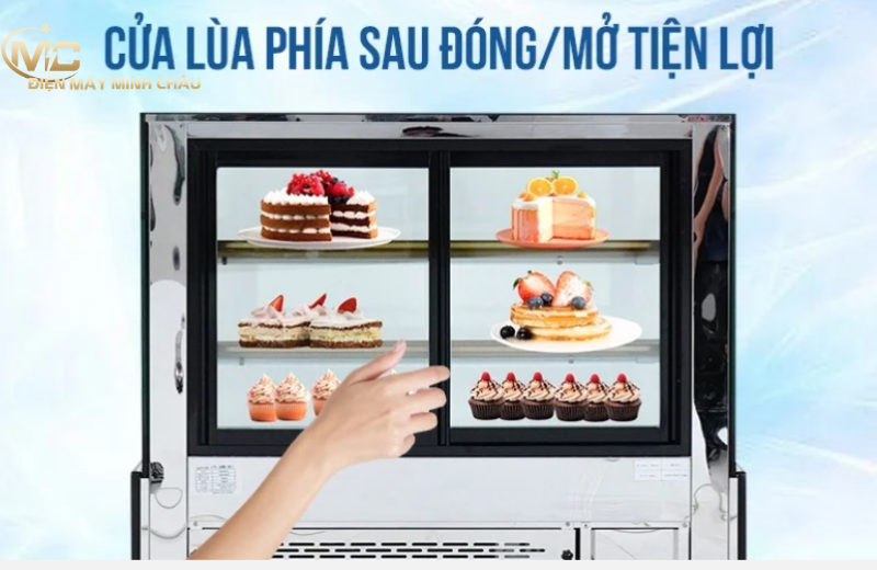 Mặt sau của tủ thiết kế dạng cửa lùa linh hoạt, dễ dàng trượt sang hai bên, giúp người dùng thuận tiện trong việc lấy bánh ra hoặc sắp xếp sản phẩm mới vào tủ.