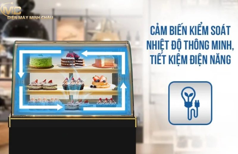 Tủ bánh kem 3 tầng 90cm kính cong ứng dụng công nghệ làm lạnh gián tiếp kết hợp hệ thống quạt gió tuần hoàn, giúp hơi lạnh lưu thông 360 độ, phân bổ đều khắp các tầng. Nhờ đó, tủ duy trì nhiệt độ ổn định từ 3~10°C (tùy cài đặt), tạo điều kiện lý tưởng để bảo quản bánh kem luôn tươi ngon, mềm mịn trong suốt 5-7 ngày.